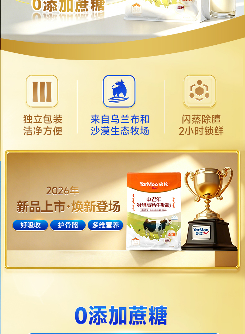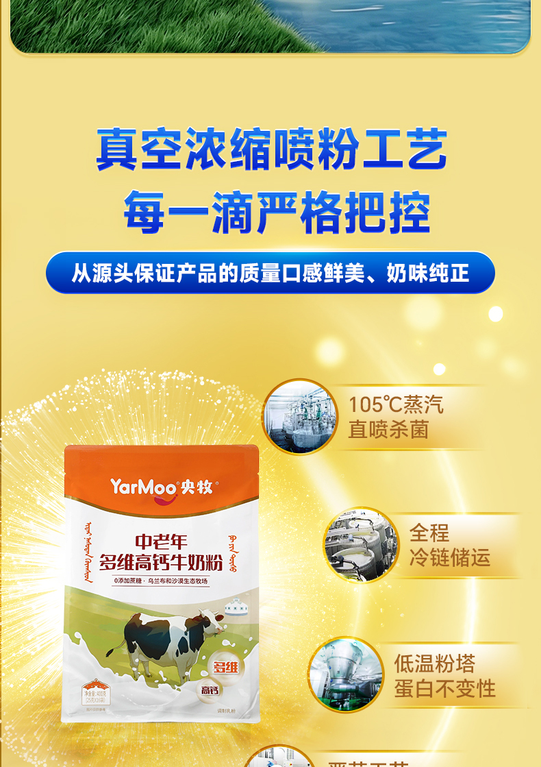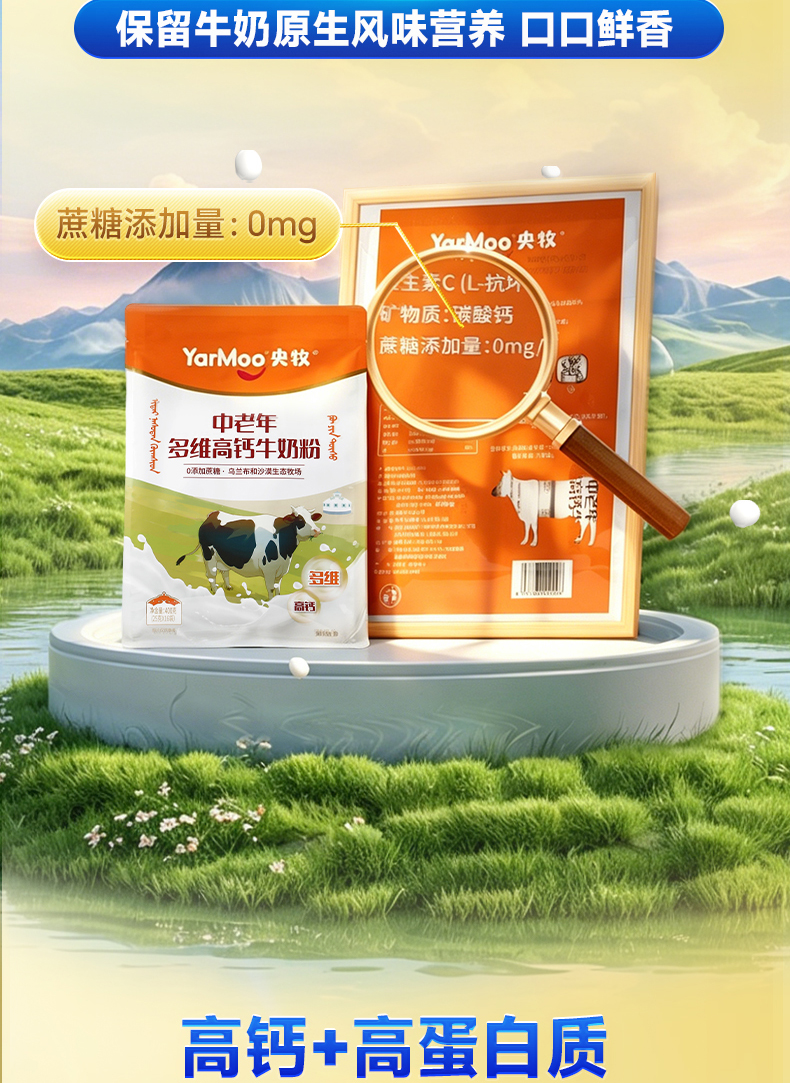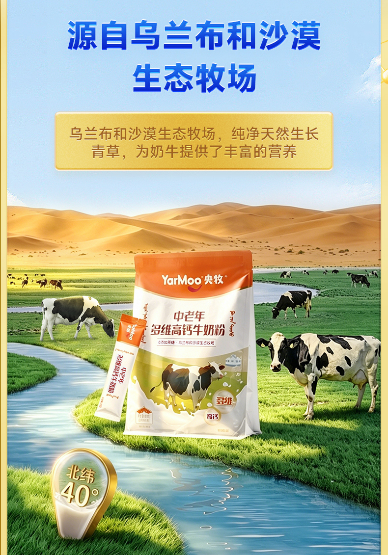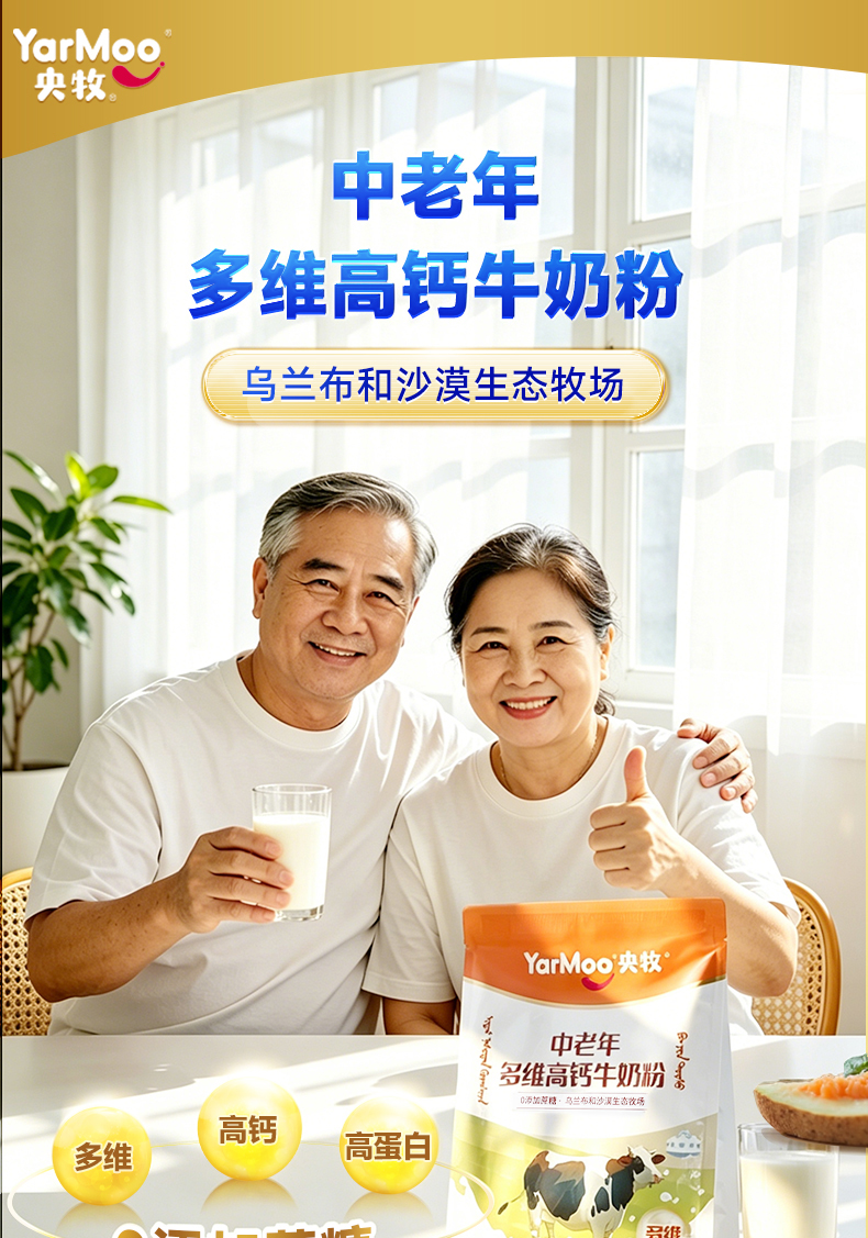 源自内蒙古乌兰布和沙漠生态牧场,采用干湿法复合工艺及冷链锁鲜,不额外添加蔗糖,高钙(550mg/100g);维生素D与维生素C协同促进钙吸收,科学配方与生态奶源结合,符合中老年群体对高钙、低糖、易吸收的营养诉求,适合日常早餐或加餐饮用。