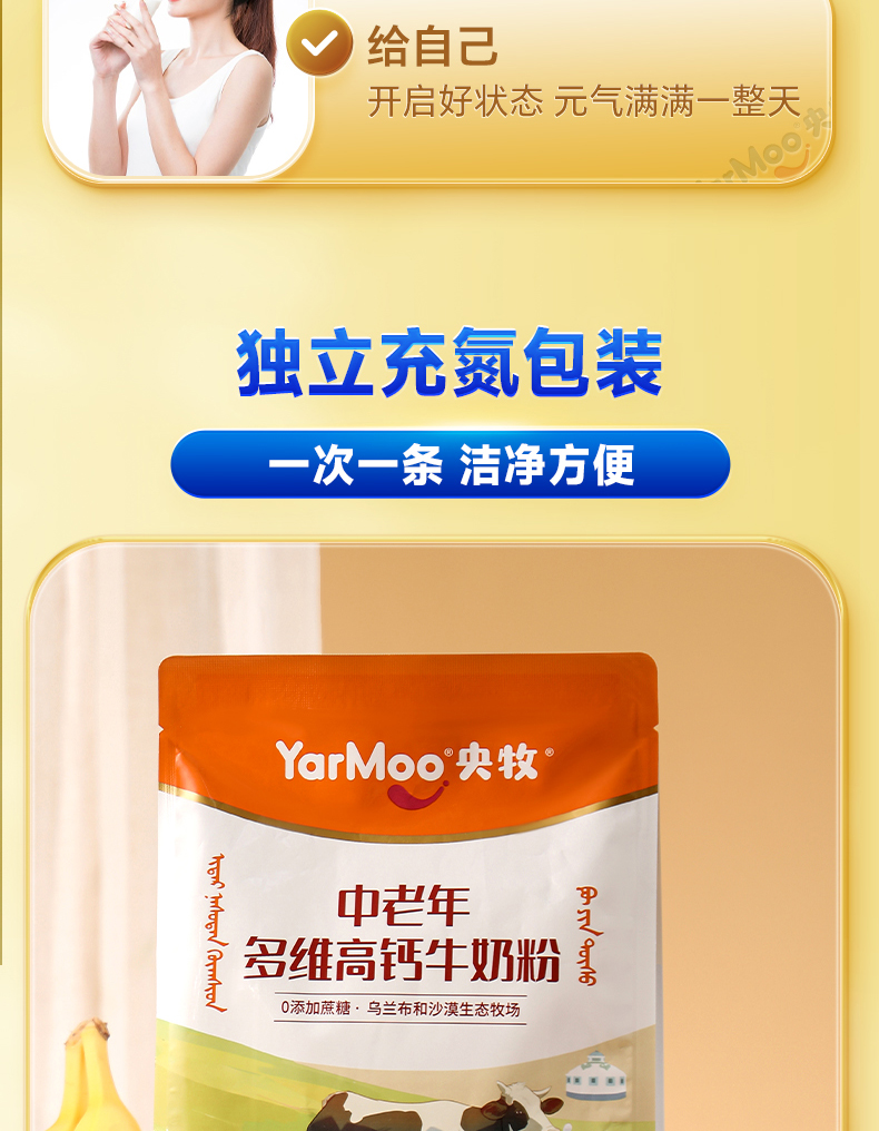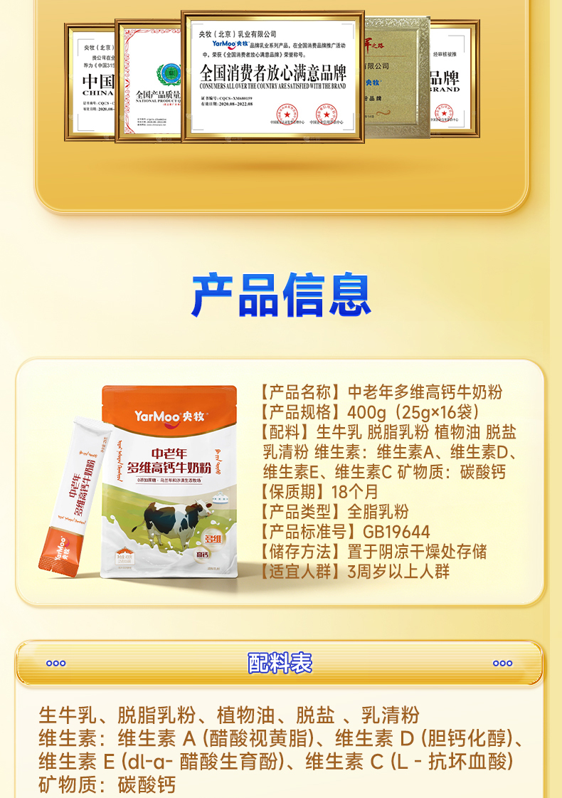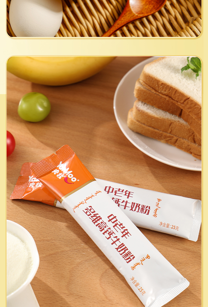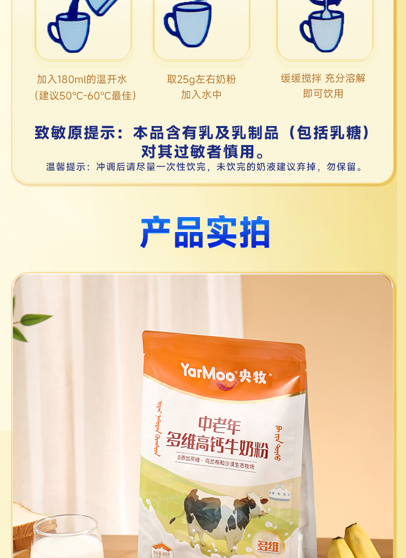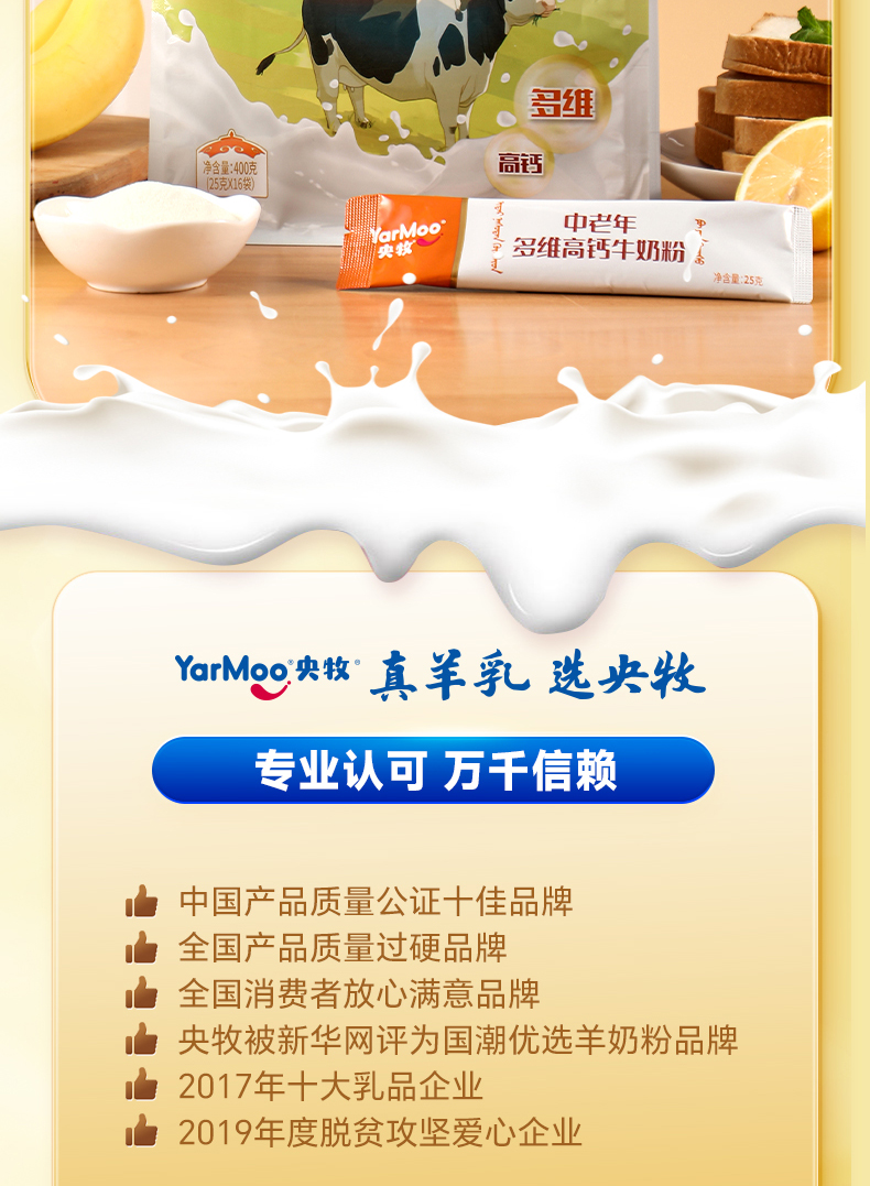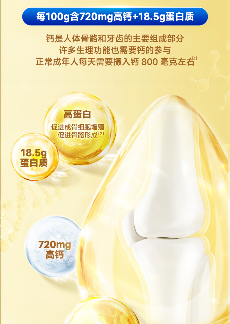 源自内蒙古乌兰布和沙漠生态牧场,采用干湿法复合工艺及冷链锁鲜,不额外添加蔗糖,高钙(550mg/100g);维生素D与维生素C协同促进钙吸收,科学配方与生态奶源结合,符合中老年群体对高钙、低糖、易吸收的营养诉求,适合日常早餐或加餐饮用。