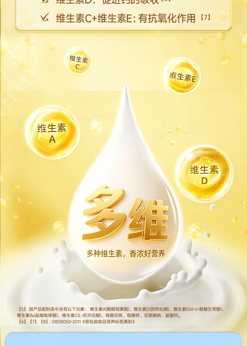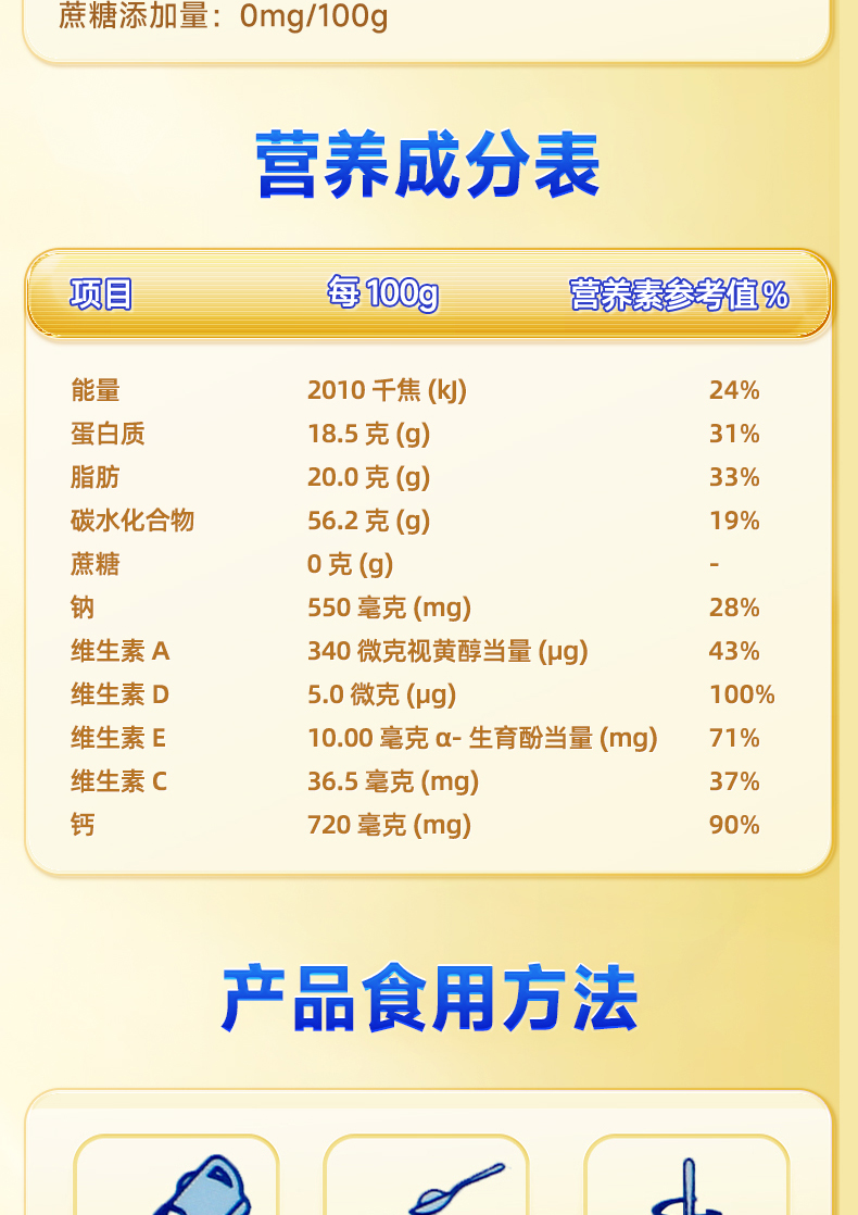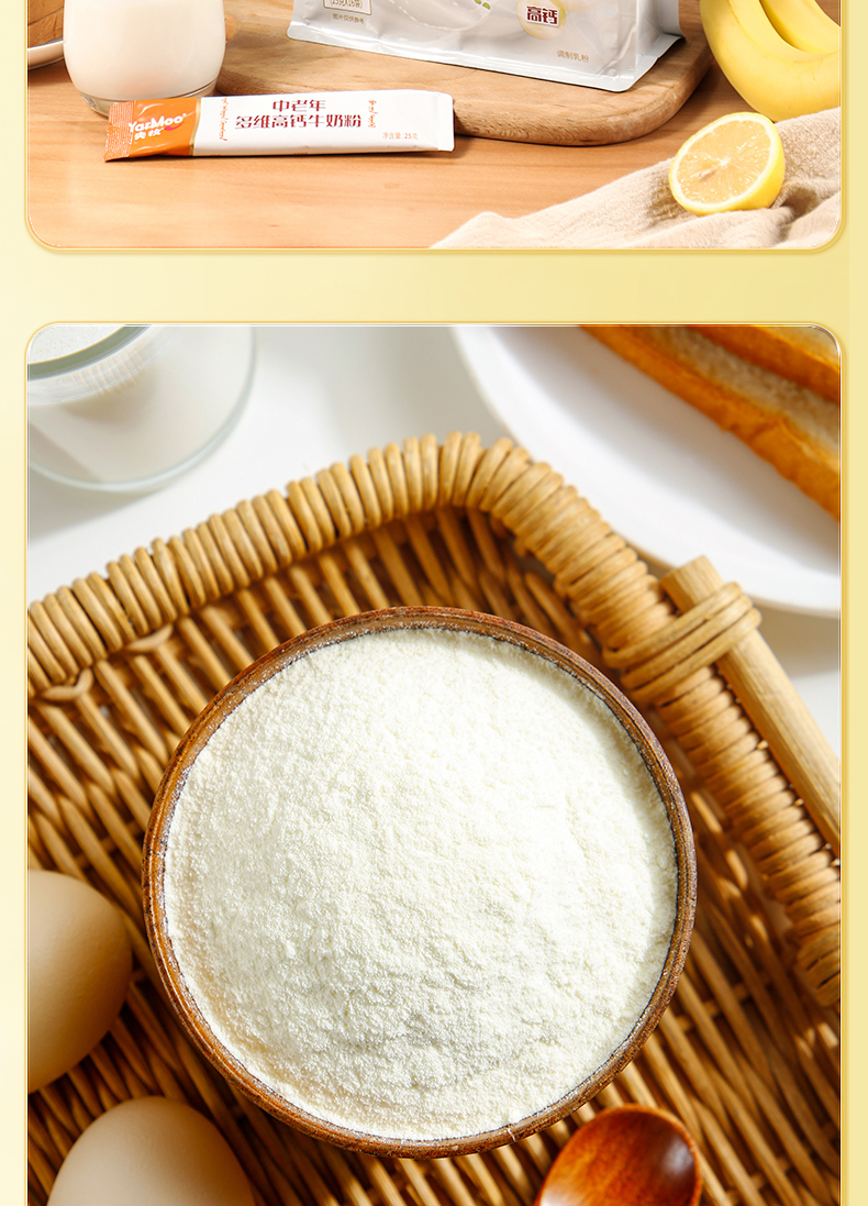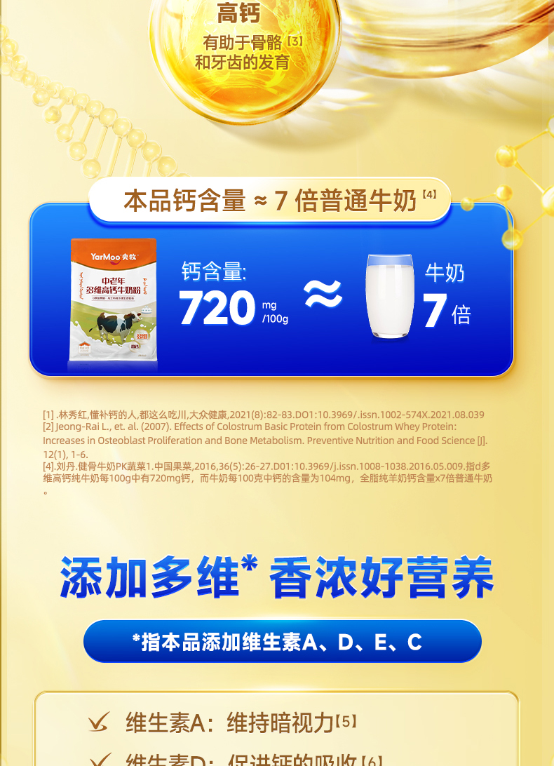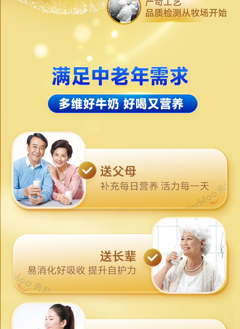 源自内蒙古乌兰布和沙漠生态牧场,采用干湿法复合工艺及冷链锁鲜,不额外添加蔗糖,高钙(550mg/100g);维生素D与维生素C协同促进钙吸收,科学配方与生态奶源结合,符合中老年群体对高钙、低糖、易吸收的营养诉求,适合日常早餐或加餐饮用。