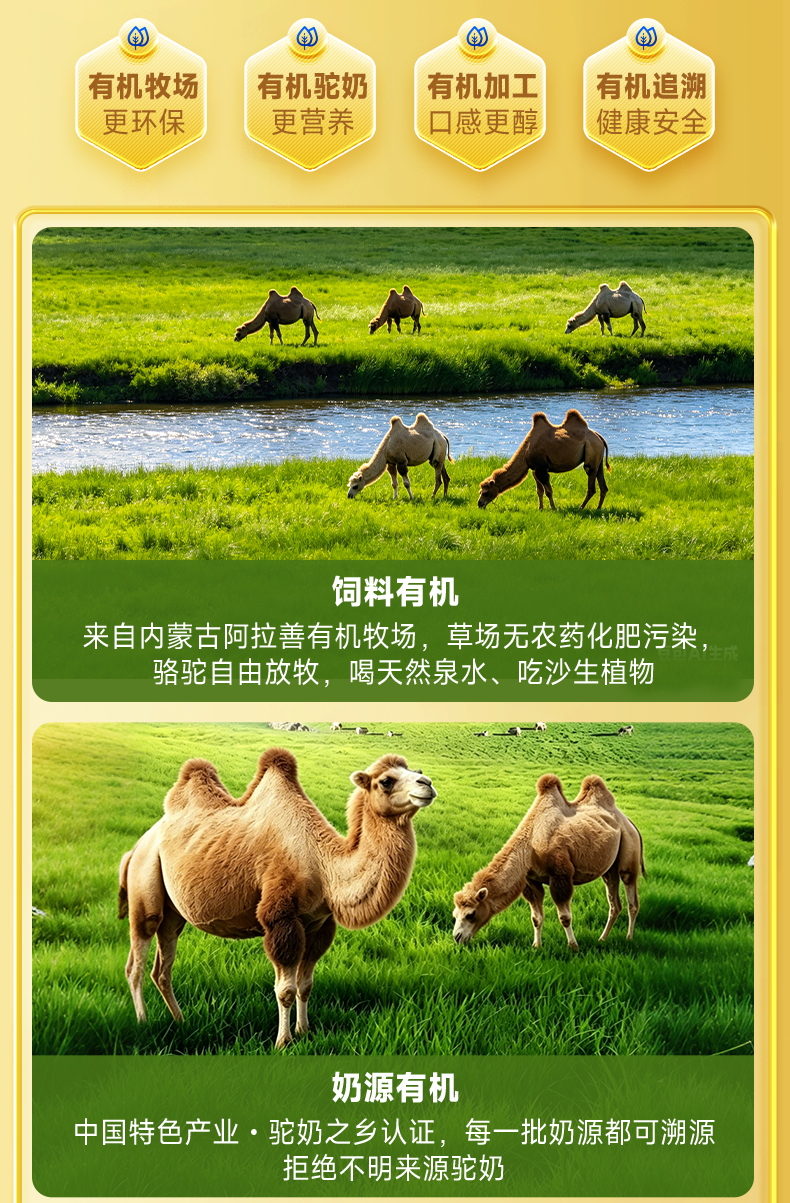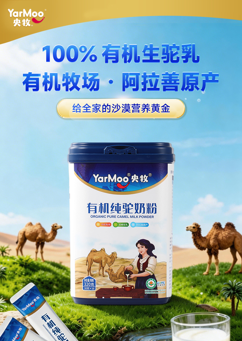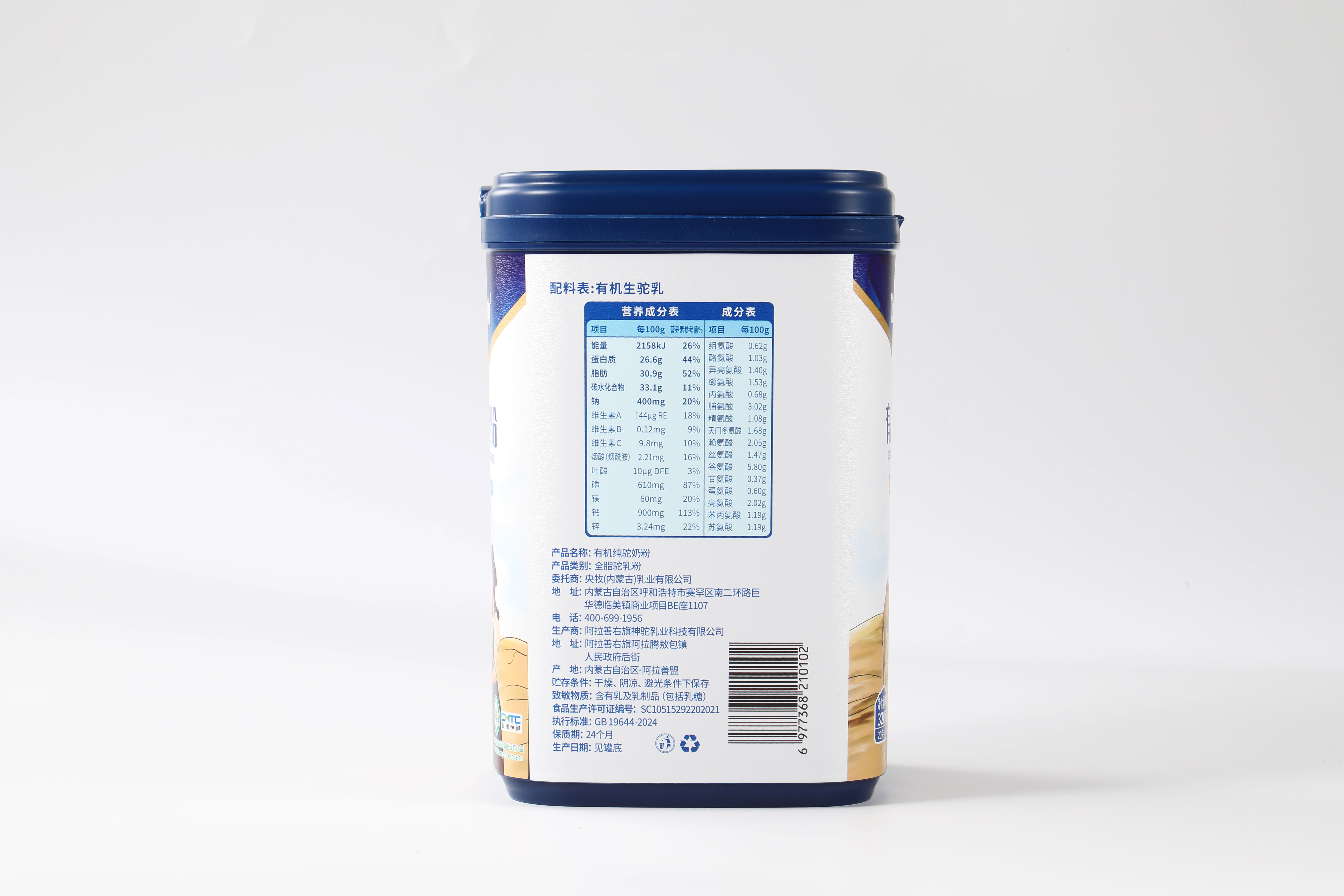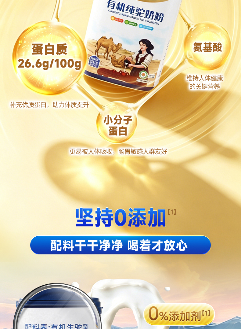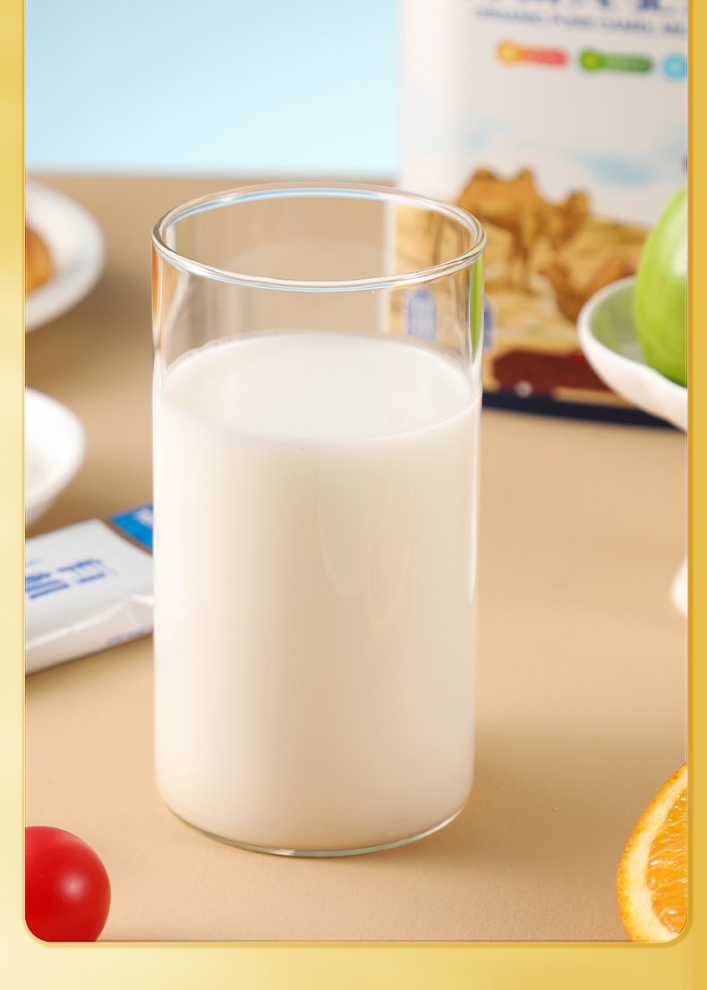 100%有机生驼乳,产地源自内蒙古阿拉善有机牧场,选用中国驼奶之乡阿拉善右旗双峰驼生乳为原料,采用干燥喷雾技术锁住新鲜营养,奶香醇厚,口感细腻,其中钙含量(900克mg/100g);蛋白质含量(26.6g/100g)远超国家标准,专为注重天然健康与营养强化的人群设计。