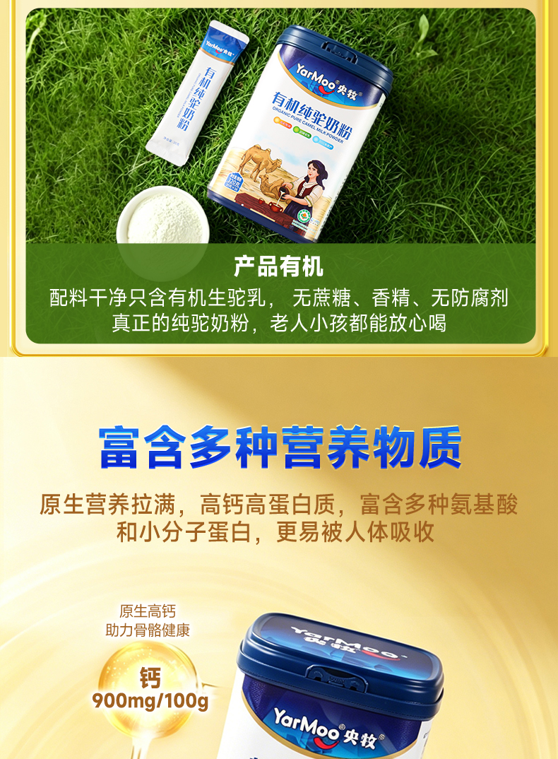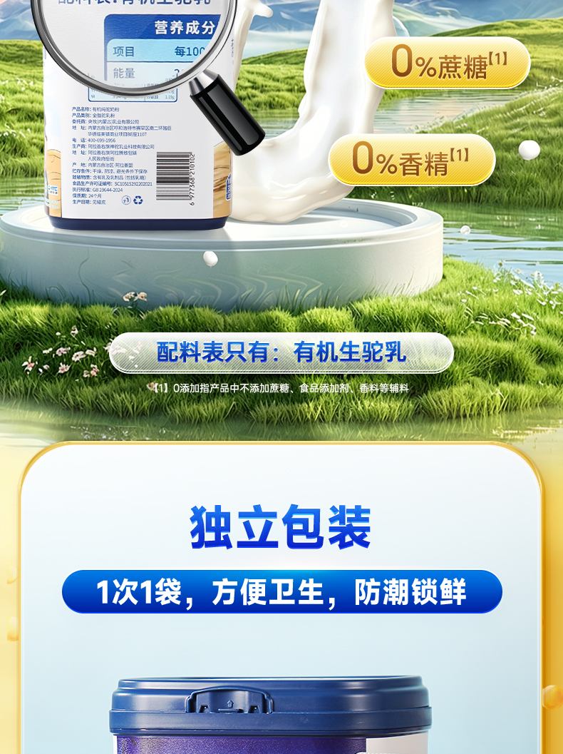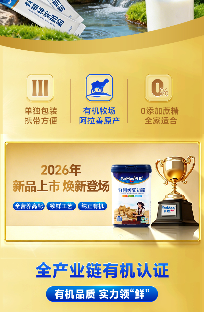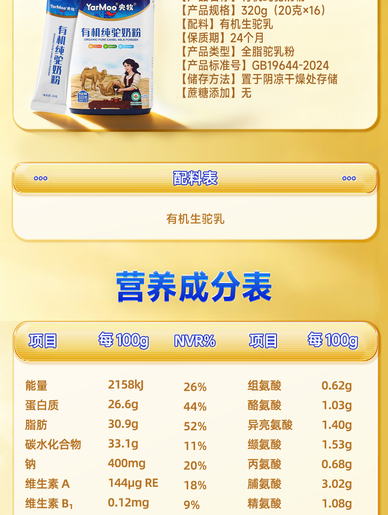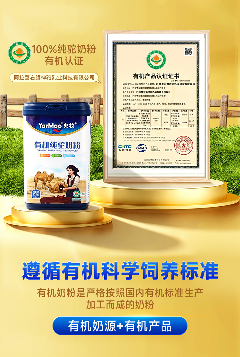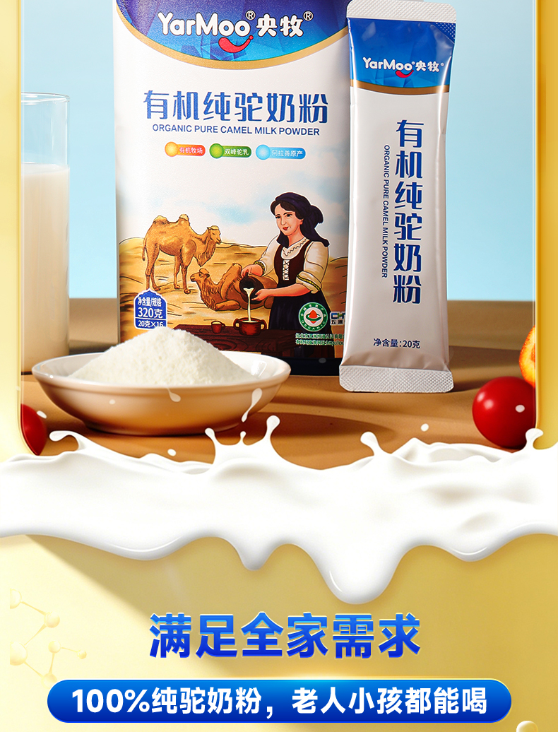 100%有机生驼乳,产地源自内蒙古阿拉善有机牧场,选用中国驼奶之乡阿拉善右旗双峰驼生乳为原料,采用干燥喷雾技术锁住新鲜营养,奶香醇厚,口感细腻,其中钙含量(900克mg/100g);蛋白质含量(26.6g/100g)远超国家标准,专为注重天然健康与营养强化的人群设计。