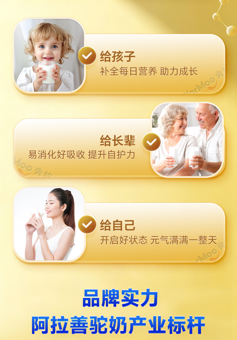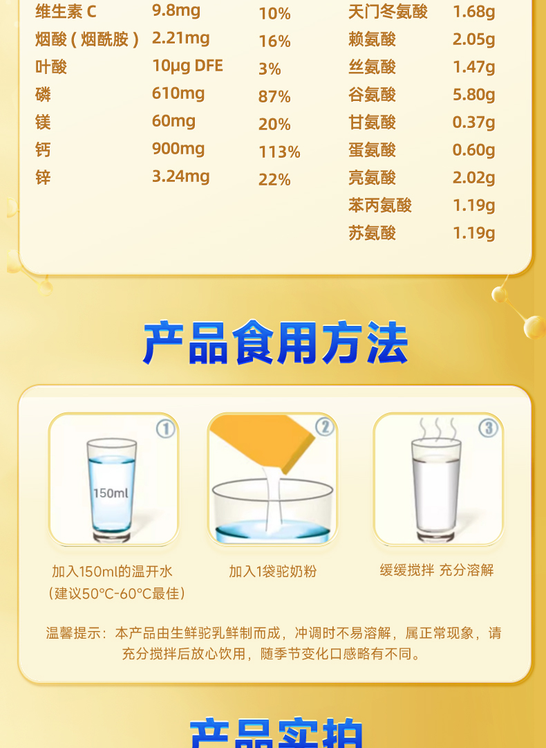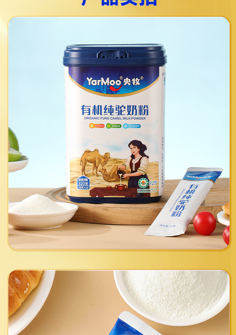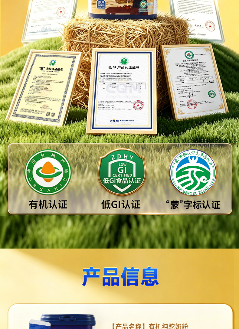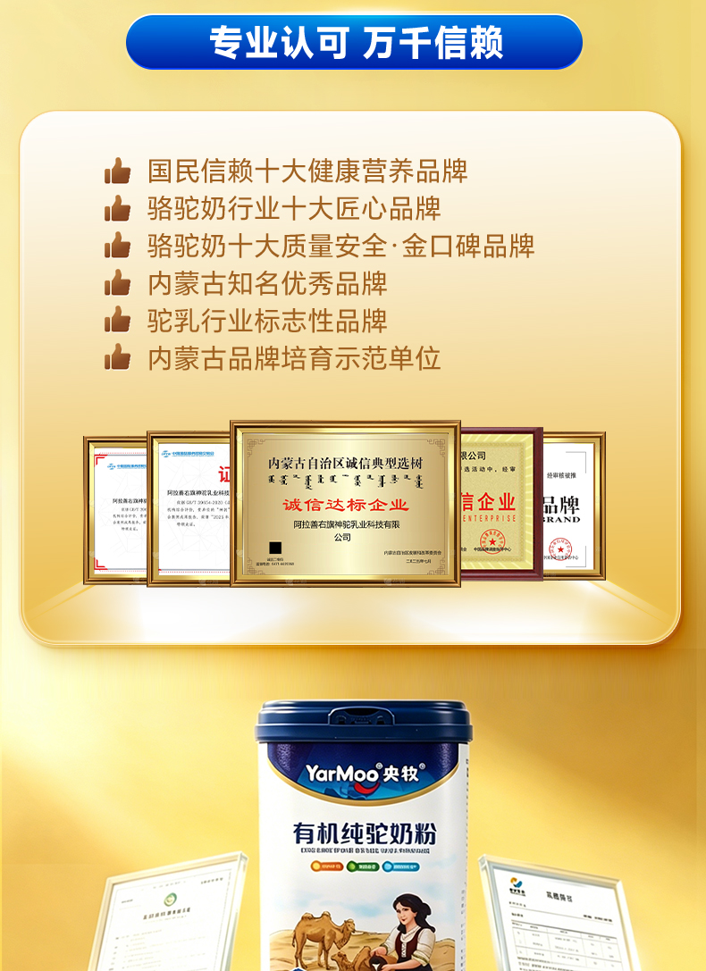 100%有机生驼乳,产地源自内蒙古阿拉善有机牧场,选用中国驼奶之乡阿拉善右旗双峰驼生乳为原料,采用干燥喷雾技术锁住新鲜营养,奶香醇厚,口感细腻,其中钙含量(900克mg/100g);蛋白质含量(26.6g/100g)远超国家标准,专为注重天然健康与营养强化的人群设计。