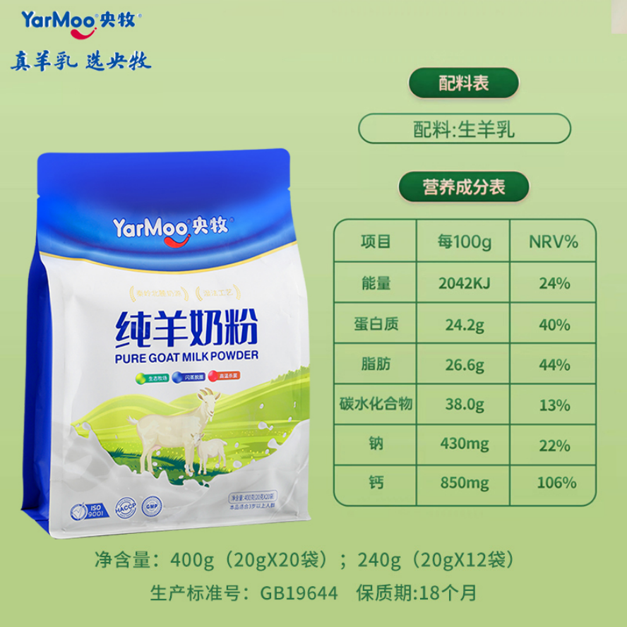 对于许多生活在都市的跑者而言,获取每日所需的鲜羊奶或许存在不便。此时,采用现代工艺制成的羊奶粉成为了理想选择,以市场上口碑良好的YarMoo央牧纯羊奶粉为例,配料表只有“生羊乳”,0蔗糖0添加。